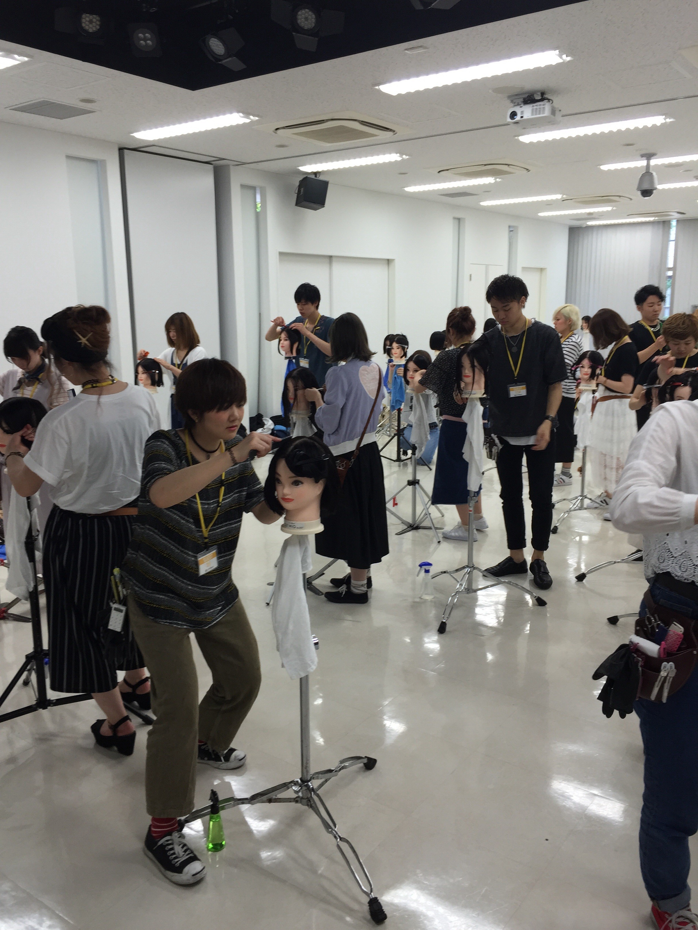 ホワイトボードや、ウィッグを使ってカットを教えます。