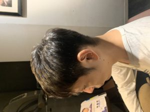 襟足、もみあげスッキリのサッパリカットです。トップのクセが強かったので少し長めに残してクセを抑えています。