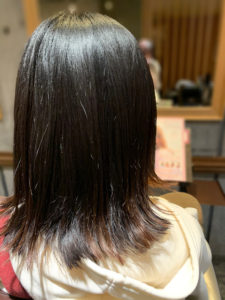 ご自身で普段からアイロンなどを使ってスタイリングされているようなので、毛量を取りつつ、切りっぱなしのピシッとした感じを消さないように切りました!