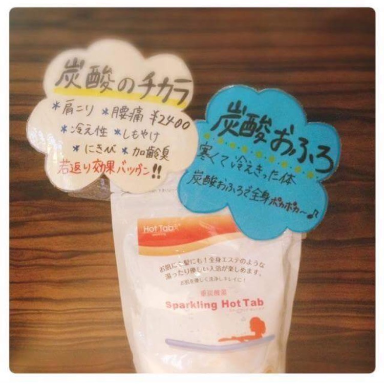 身体の芯からポカポカに! Posted on 2015年12月9日 『寒くなってきている今にぴったりなアイテム★』 日に日に寒くなってきて 冬本番になってきていますね。 身体の芯まであったまりたい… そんな時は!! 『炭酸』の力を借りましょう♪♪ 炭酸ホットタブの特徴は↓↓↓ 疲労回復・冷え性・肩こり 腰痛・リウマチ・神経痛・あせも ひび・あかぎれ・ニキビ これらの症状を和らげてくれます!! がんばって働く身体に 夏の疲れを取りたい方 低い体温の方や肌の弱い方 ぜひ炭酸タブをお試し下さい♪ CHROMA 塩田千紘